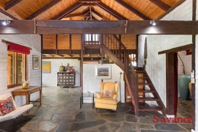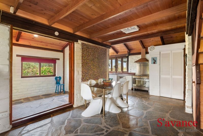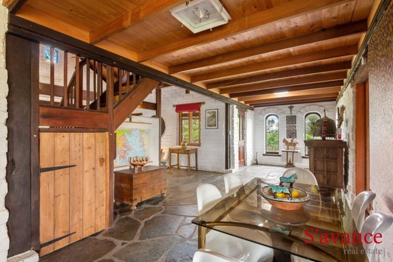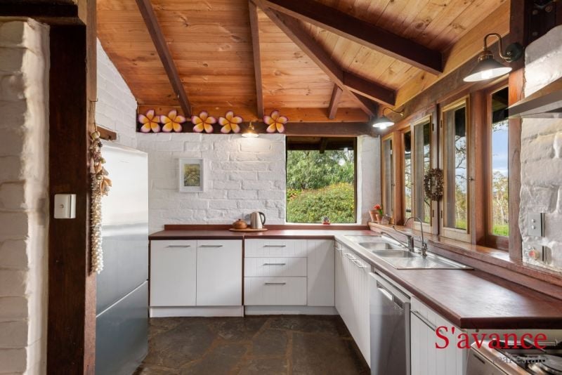 • Open-Plan Living: The large living room boasts high raked timber ceilings, flagstone slate flooring, and a combustion heater, complemented by a ceiling fan and AC unit for year-round comfort.