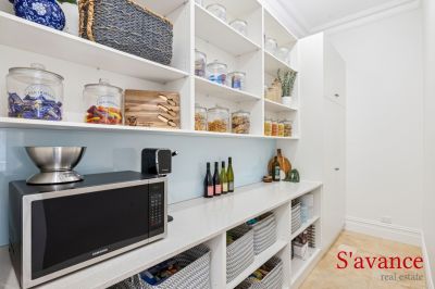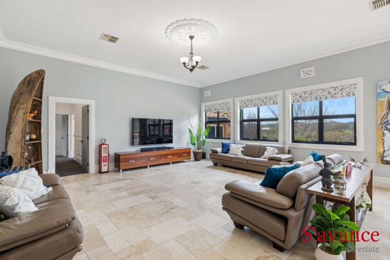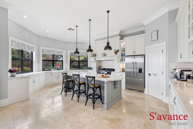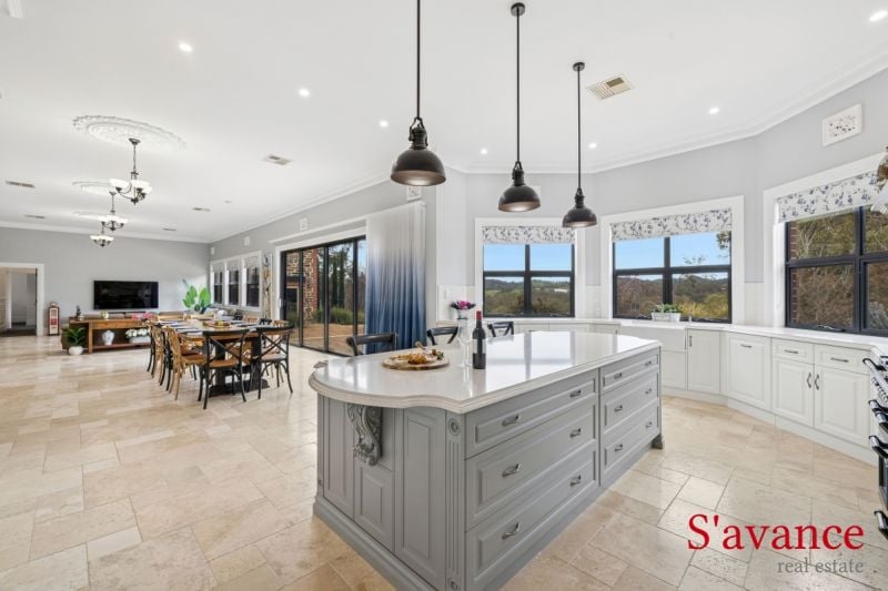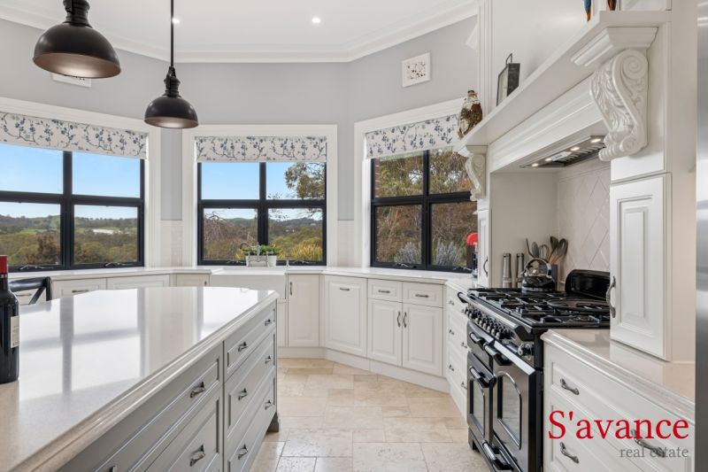 The formal lounge and dining room unfold like a theatre for life's best evenings – a generous, elegant canvas where candlelight and conversation gather around a flickering fire. Step through to the heart of the home, and you arrive at a kitchen that's quietly spectacular. A handcrafted Alby Turner creation that balances refined beauty with uncompromising function. Stone bench tops, an island made for casual breakfast and a place for guests to gather, abundant bench space and rows of custom cabinetry meet a huge walk-in pantry that swallows prep, storage and the second fridge with ease. The kitchen spills into an expansive living and dining area, where sunrise light bathes the room each morning. Make a coffee, open the blinds and watch the valley wake as the house fills with warmth. Both the front entertaining lounge and this vast family hub are designed for celebration and daily comfort alike.