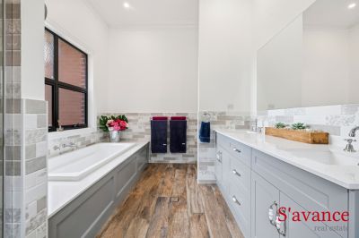 The master suite occupies its own private wing, finished with timber panelling, dual walk-in robes and an ensuite that is simply a statement piece: oversized, opulent and impeccably appointed. More private retreat than convenience - a bathtub set by the window invites you to soak while the garden performs its slow, therapeutic magic. The main bathroom & laundry are equally generous and beautifully appointed whilst the remaining bedrooms are amply sized and fitted with quality robes.