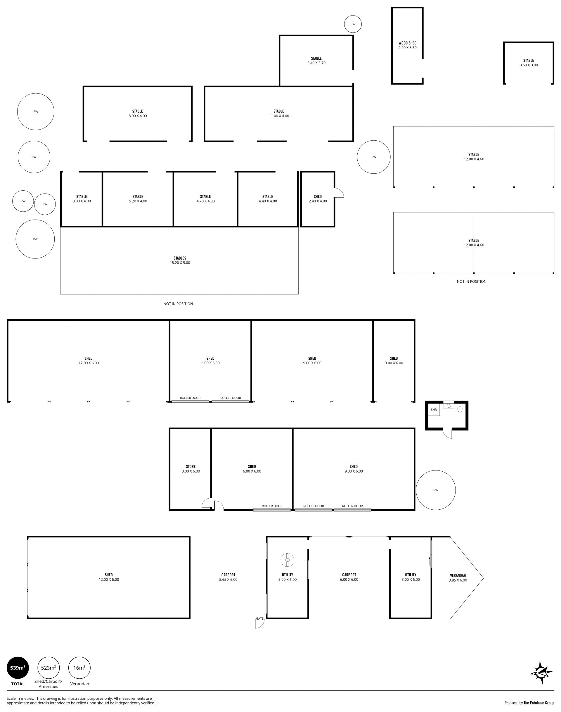 - 18 m x 6 m shed divided into 3 zones. Concrete floor and power. Horse wash bay and tie area at one end. Outdoor bathroom with toilet/shower/handbasin (hidden in tool shed) on other end.