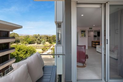The open plan living and dining area is bathed in natural light, thanks to the expansive lofty ceilings and floor-to-ceiling glass double sliding doors. From here, you can relish stunning views of both the picturesque parklands, and the beautiful city to the north, making every outlook a serene escape.