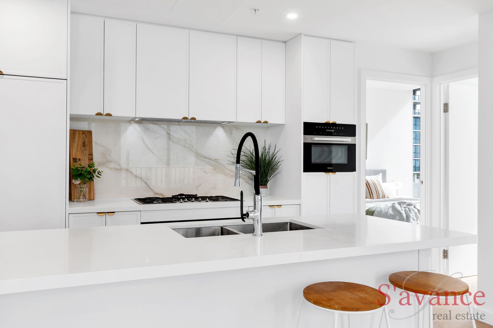 The contemporary kitchen will be the delight of any chef, featuring premium Miele appliances, 900mm wide gas cooktop with wok burner, a 900mm electric oven, dishwasher, an integrated microwave, and fridge/freezer. Every detail has been fashioned with precision, from the elegant finishes to the exquisite craftsmanship.