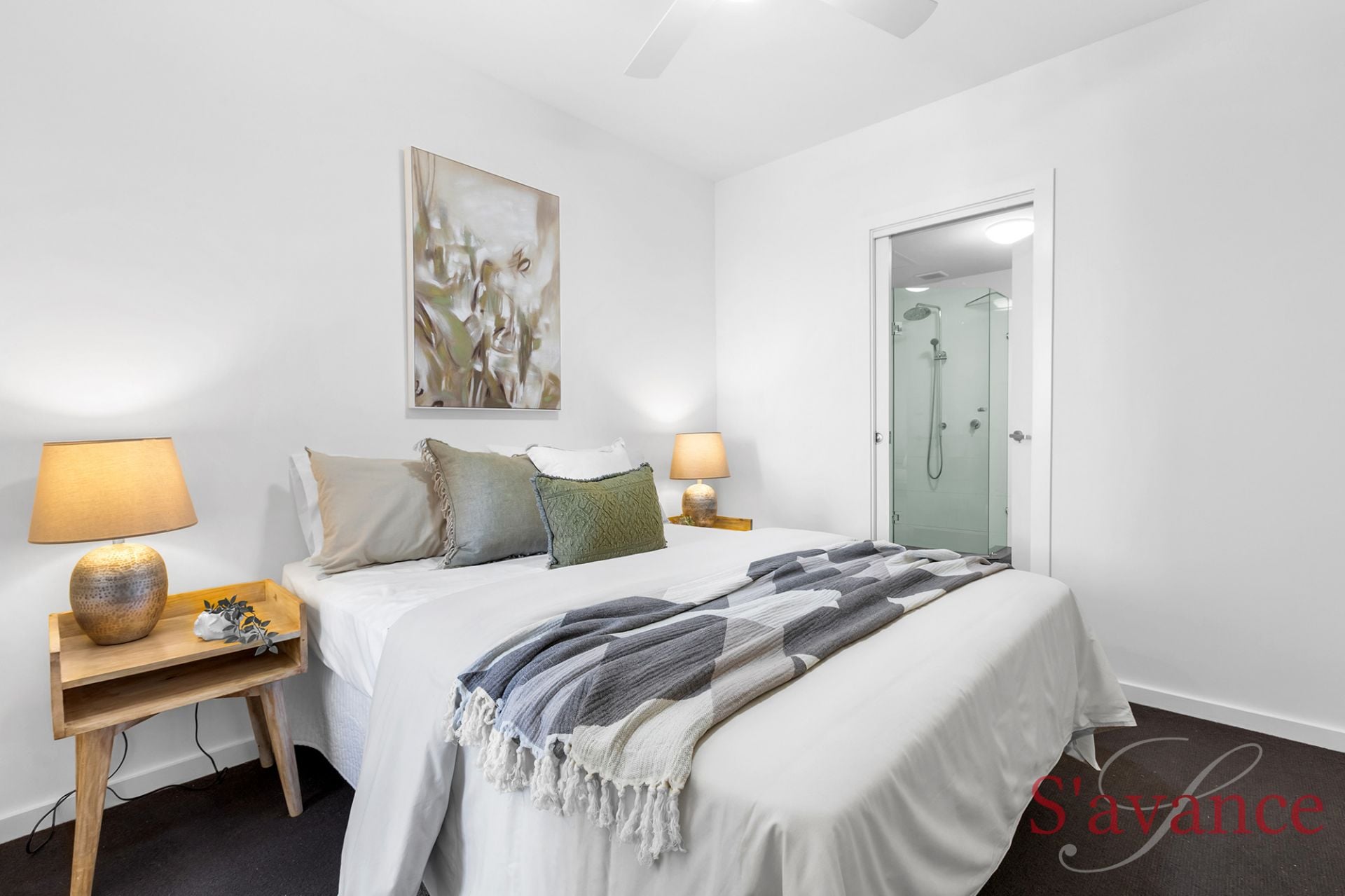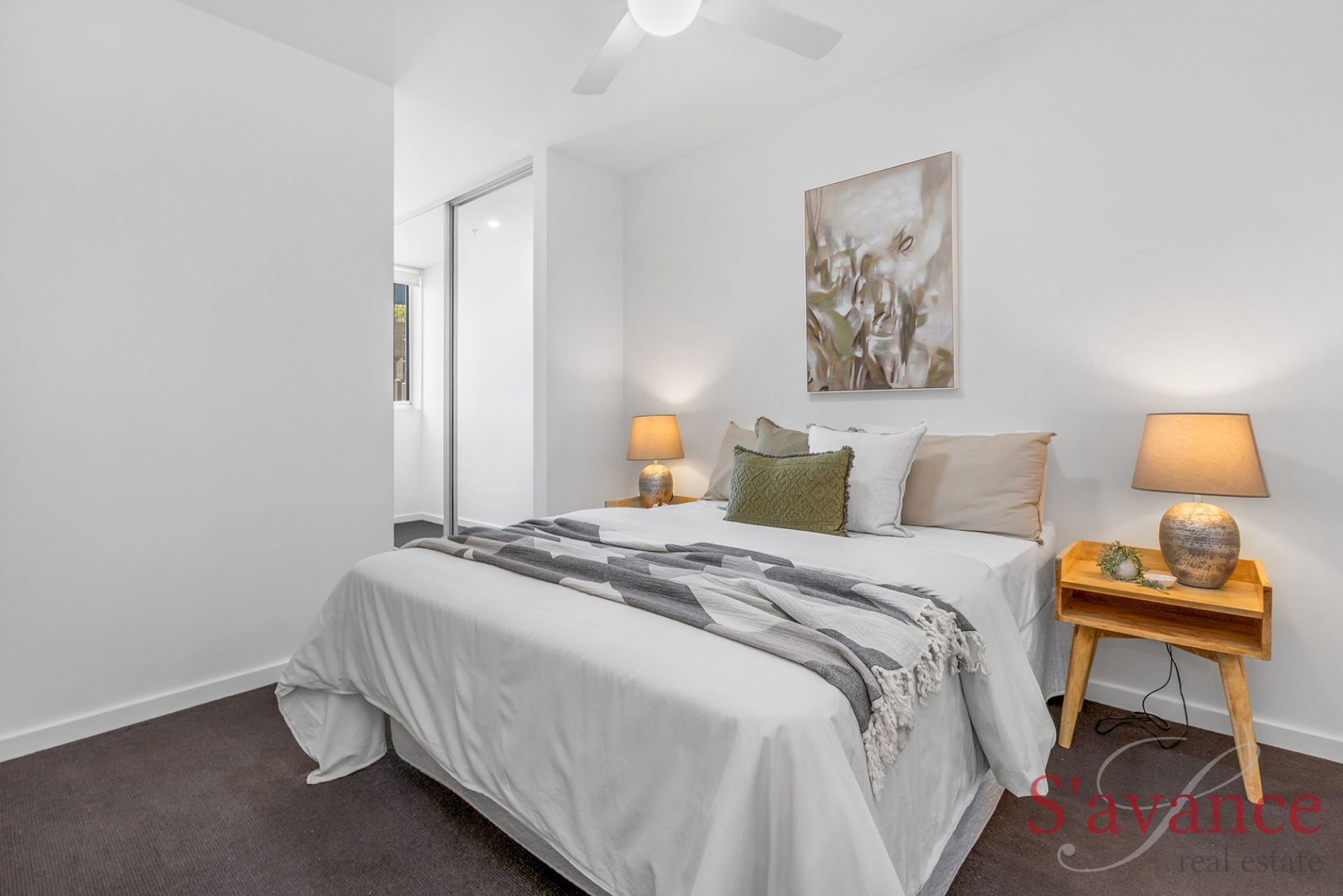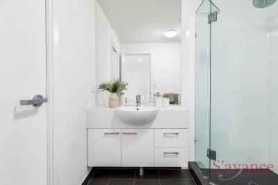 This apartment is impressive, and features two generous bedrooms, both fitted with plush carpets, ceiling fans, and extensive built-in robes to maximize storage. They share access to a sparkling contemporary bathroom that features premium fixtures and a clean, modern aesthetic. Unlike many city apartments, this residence features a dedicated, fully separate laundry room complete with additional linen storage, offering a level of domestic practicality rarely found in inner-city living.