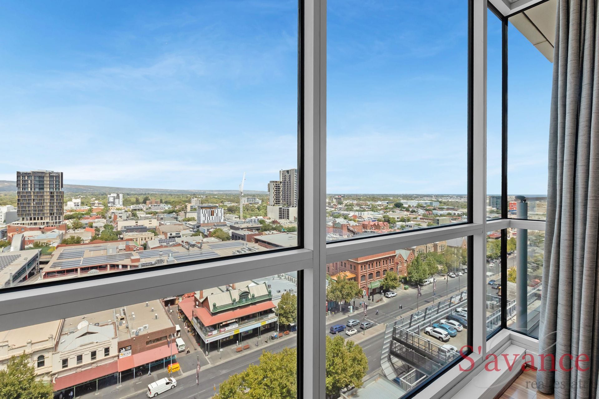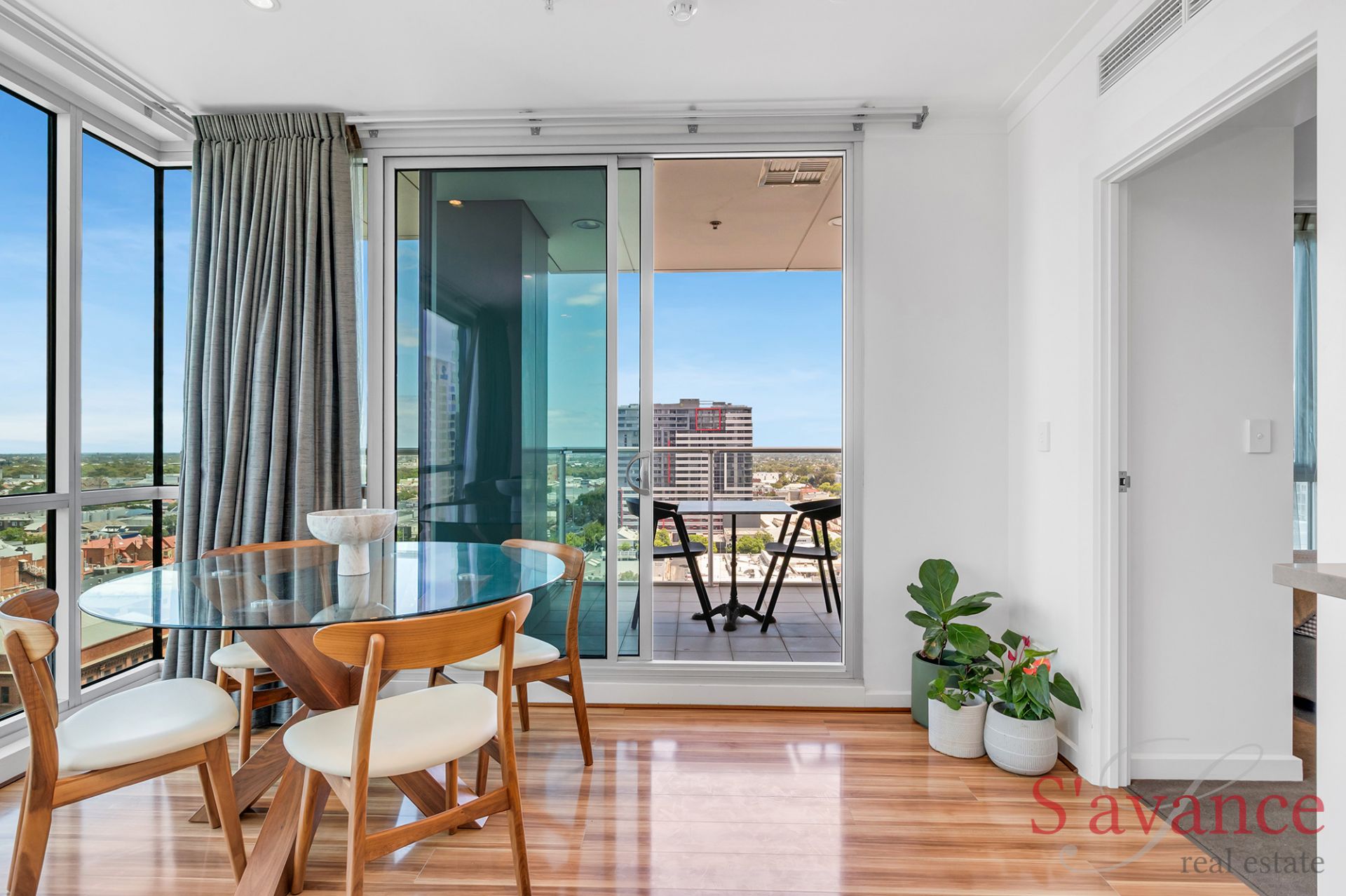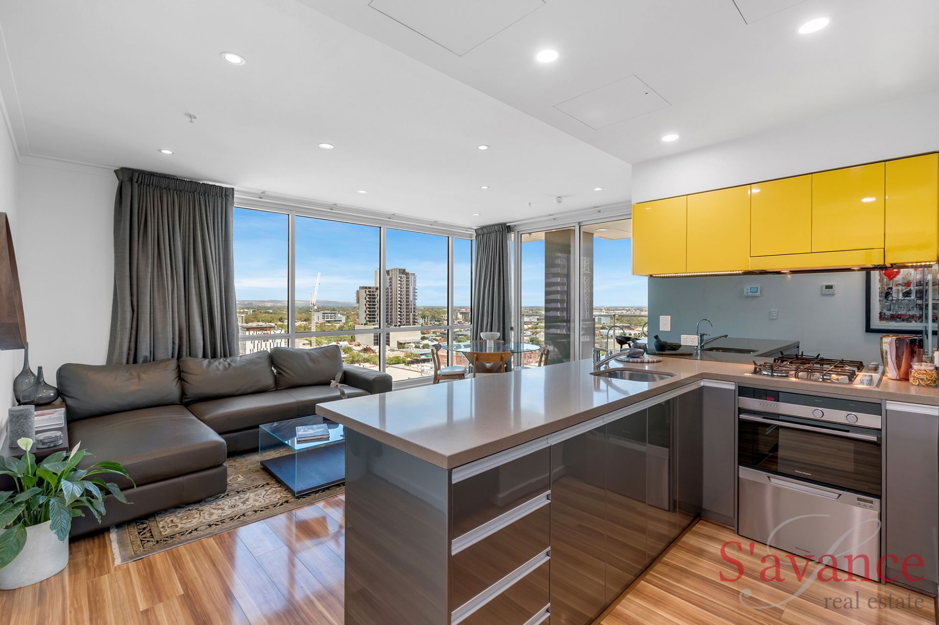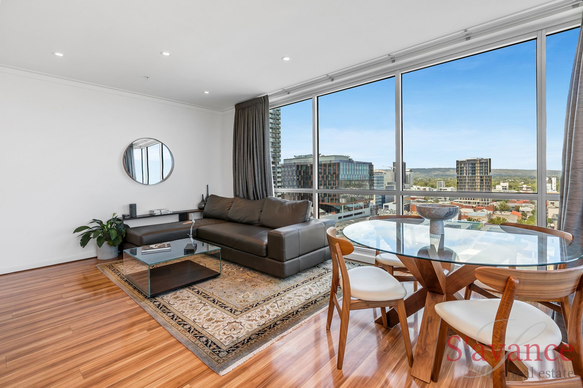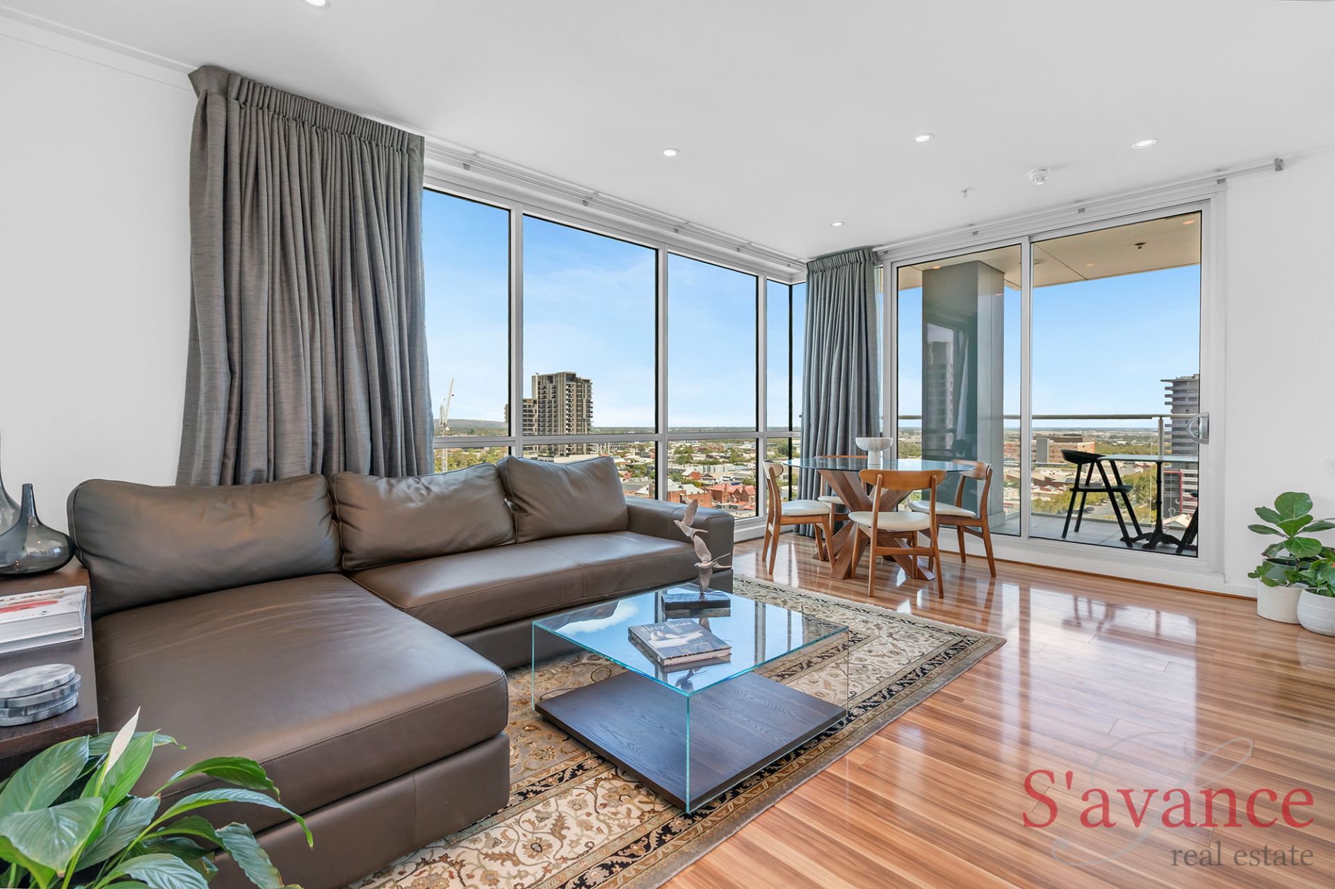 Inside, the apartment immediately impresses with a light-filled open-plan living space framed by floor-to-ceiling glass on two sides. This striking architectural feature draws in natural light throughout the day and showcases sweeping views across the city skyline, stretching to the Adelaide Hills and out toward the sea - creating a living environment that feels elevated, open, and truly connected to its surroundings.