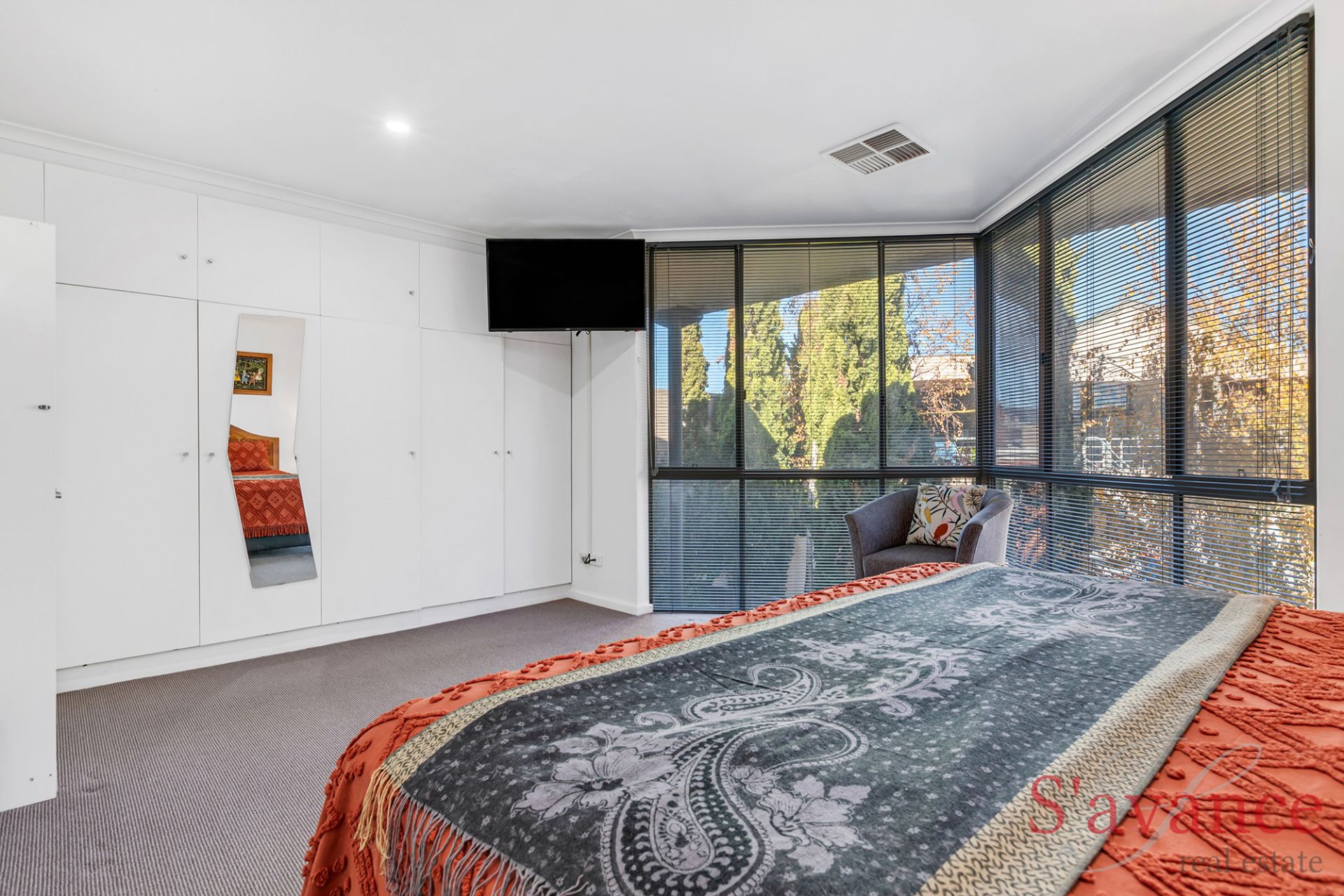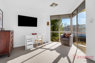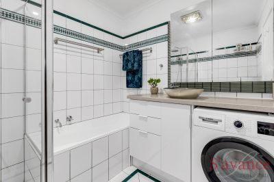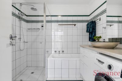 The main bedroom is a spacious retreat, easily accommodating a super king bed with side tables, and featuring wall-to-wall built-in cupboards and floor-to-ceiling windows overlooking your private courtyard and leafy backdrop. Bedroom 2 offers similar amenities, with the potential of adding a sliding door to an external balcony utilising the existing roof space over the carport (stcc).