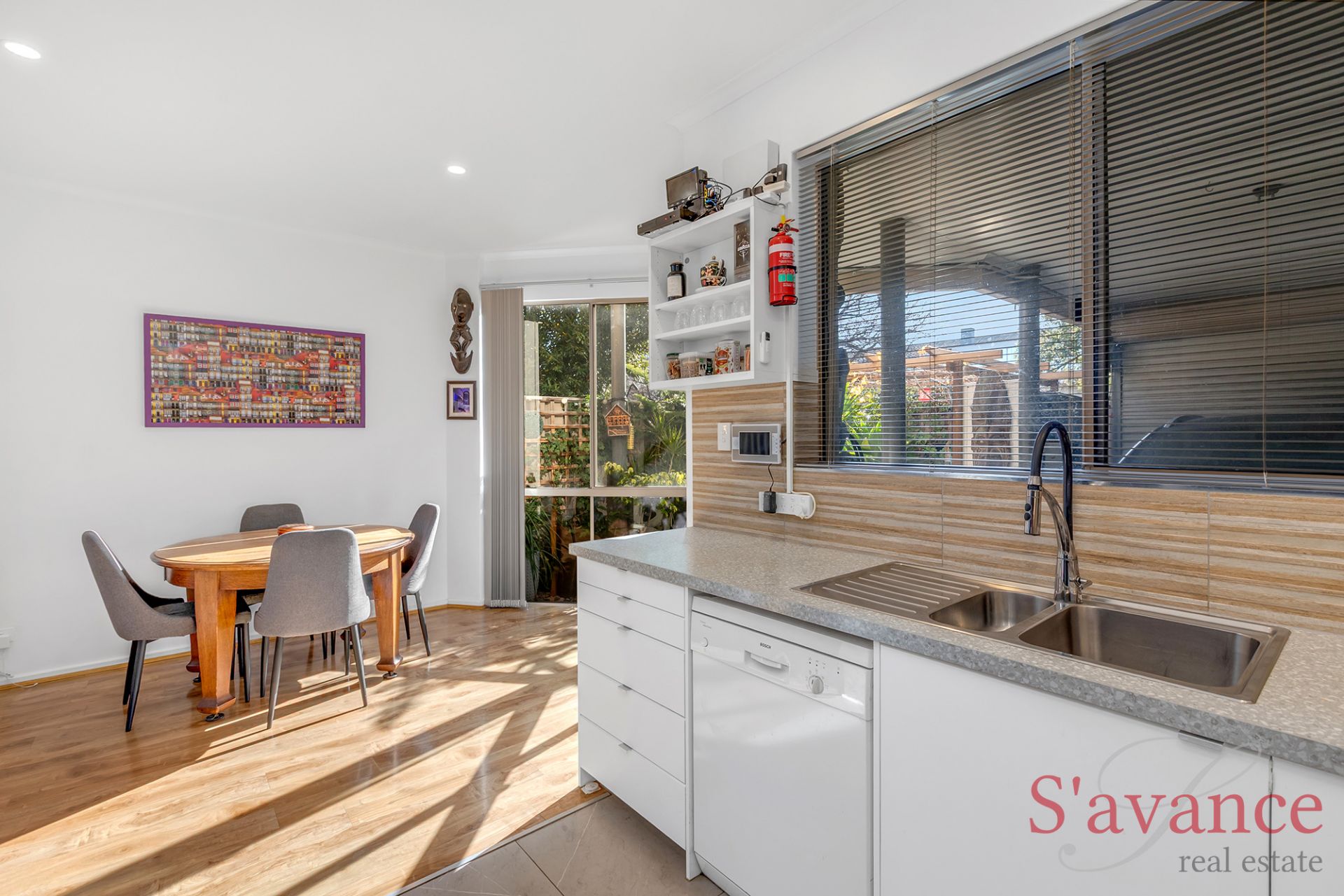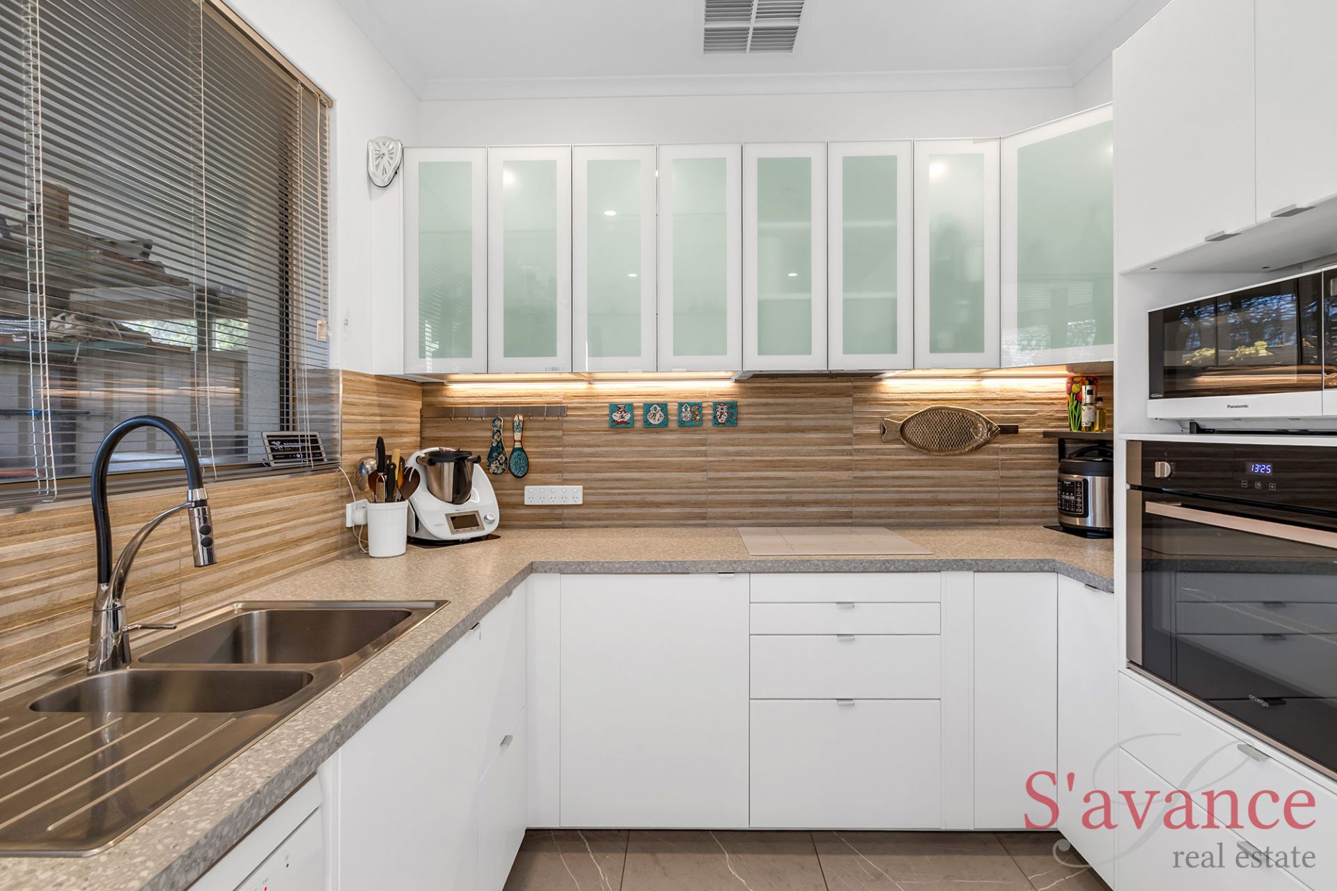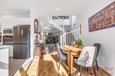 The entry opens into the light-filled dining and kitchen area, where floor-to-ceiling picture windows flood the space with natural light. The new gourmet kitchen boasts a stylish textured splashback, an abundance of cupboard space, dishwasher, induction cooktop, and ambient bench and overhead cabinet lighting – a true chef's delight.