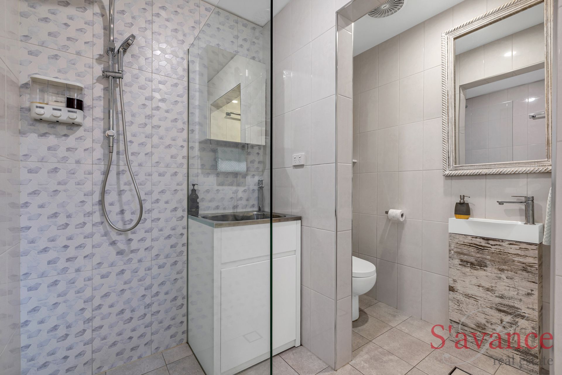 The ground floor includes a well-appointed bathroom with a shower, toilet, and linen cupboard. A clever use of space under the stairs provides a dedicated wine cellar with more storage alongside.